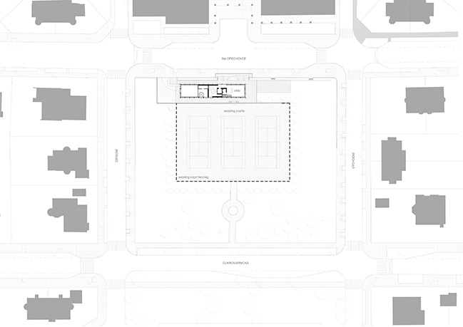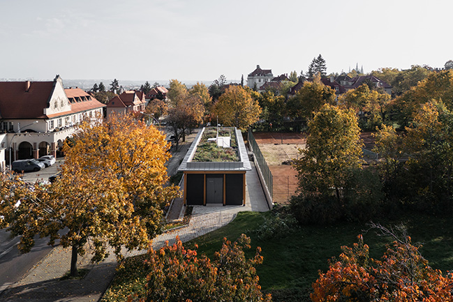 From the architect: The new tennis club pavilion is located in the very heart of Prague's district of Ořechovka. It was built on the site of a small wooden clubhouse that stood there during the First Republic, which was replaced in the 1980s by a temporary building of prefabricated site units. This 'temporary structure' lasted for almost 50 years and has deteriorated badly.