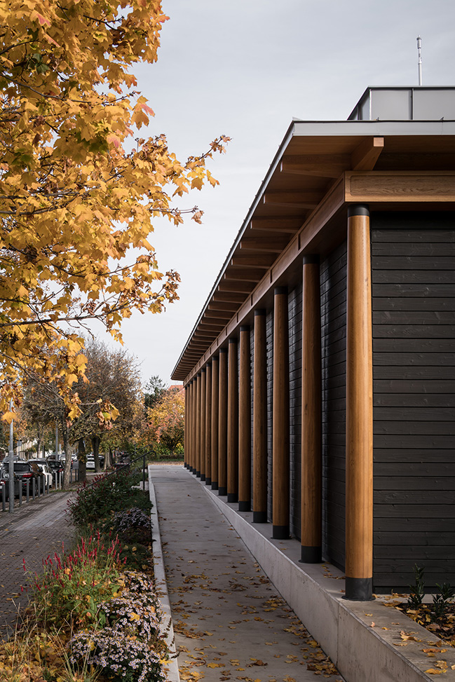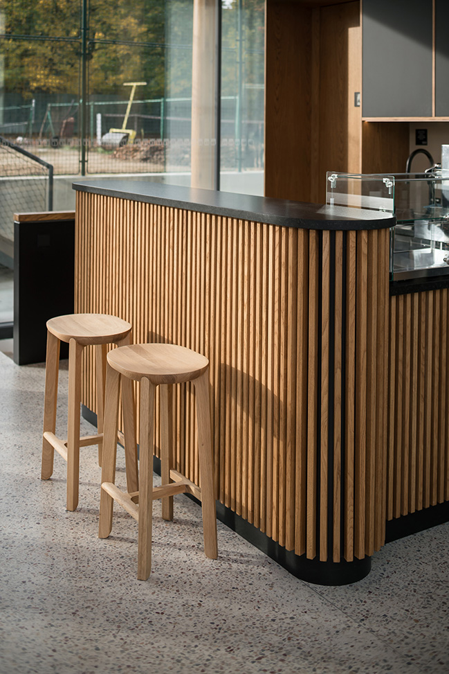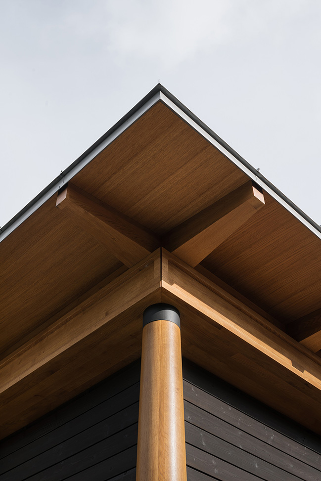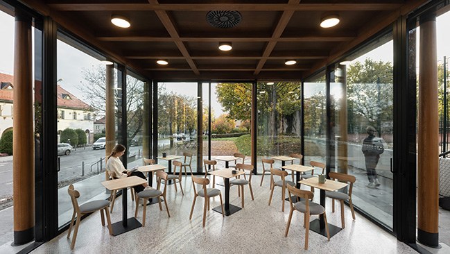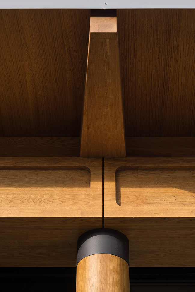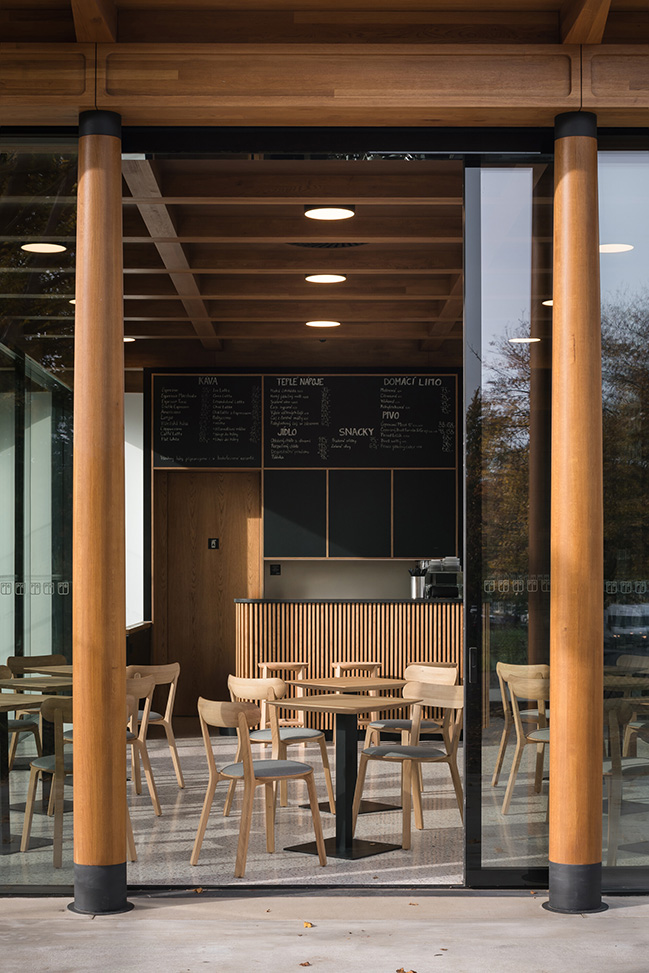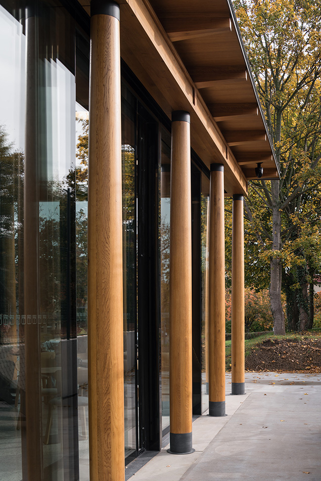 The wooden structure is intentionally lightweight and built on columns like a garden pavilion in the middle of a park. Its expression evokes spa gazebos and colonnades associated with tranquility. The building uses classic architectural elements such as a plinth, a column row and a lintel with a cornice. The wooden oak columns are load-bearing and use the proven principle of entasis for their elegance. They are supported by architraves with simplified friezes and then a coupled frame ceiling structure. The protruding rafters taper at their ends to soften the visual effect of the roof edge. The emphasis is on quality, durability and craftsmanship of materials.