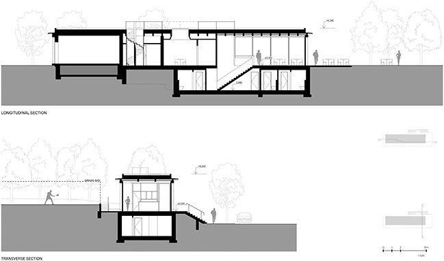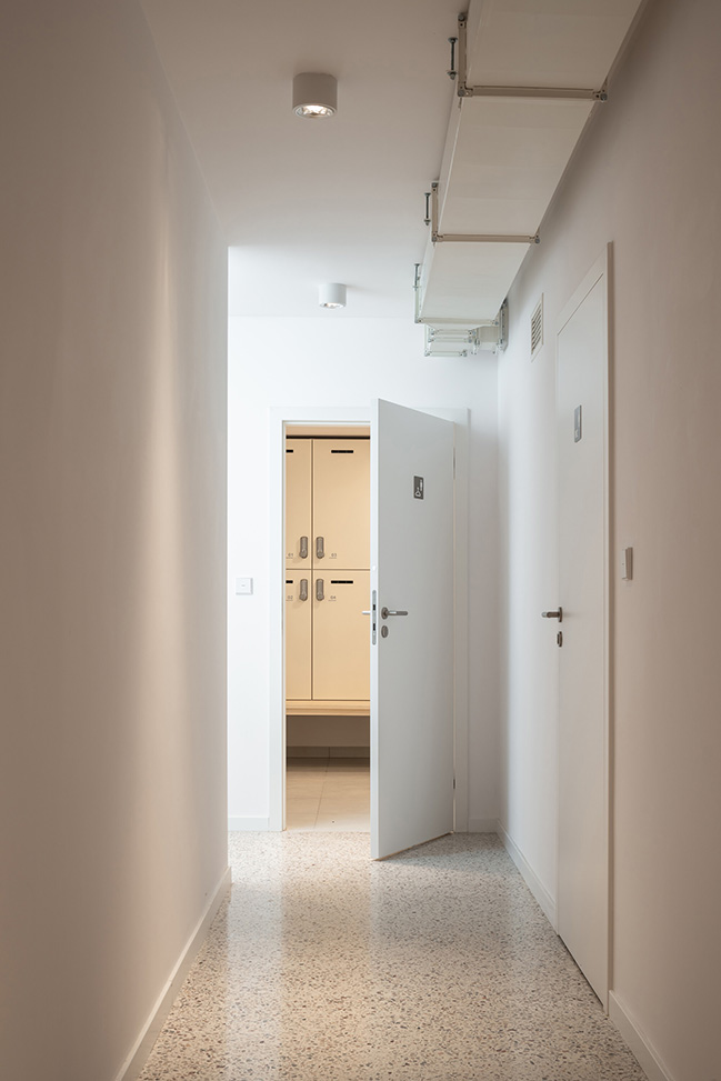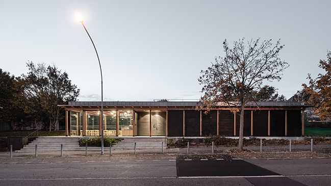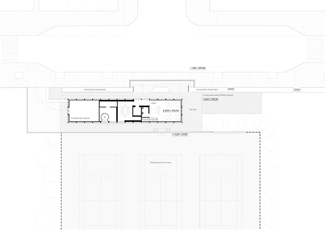 The above-ground part of the tennis club is defined by a glass café open on three sides with access to the changing rooms and the playground, followed by the clubhouse, public toilets and storage rooms. A spiral staircase leads up to the rooftop viewing terrace. At first glance, it is not noticeable that the upper part of the building covers the existing brick substation. In the lower part, the changing rooms and toilets are hidden under the adjacent terrain to make the building appear optically smaller and to integrate it into the context of its surroundings.