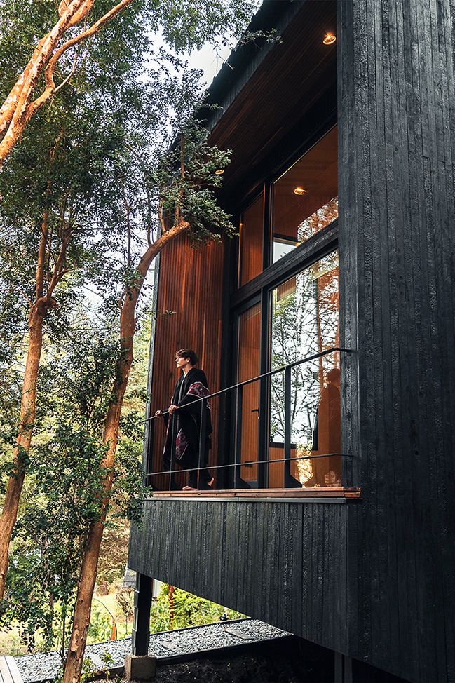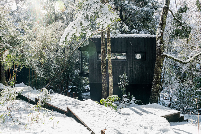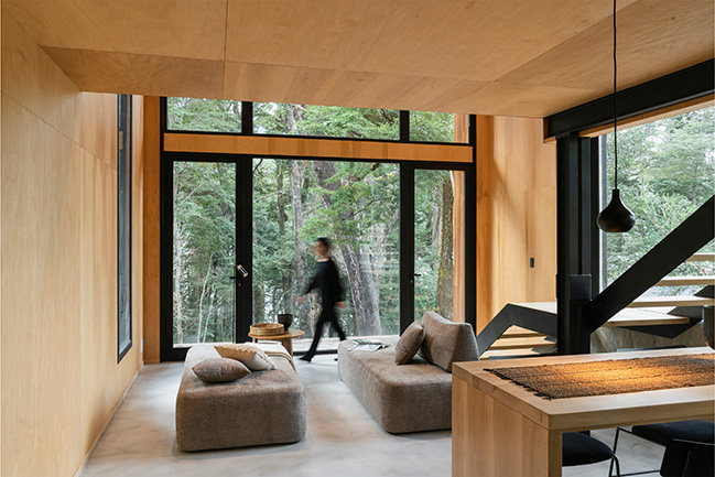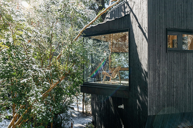 Despite their compact footprint, the cabins offer a captivating spatial experience—dissolving the boundaries between the interior and the surrounding forest.