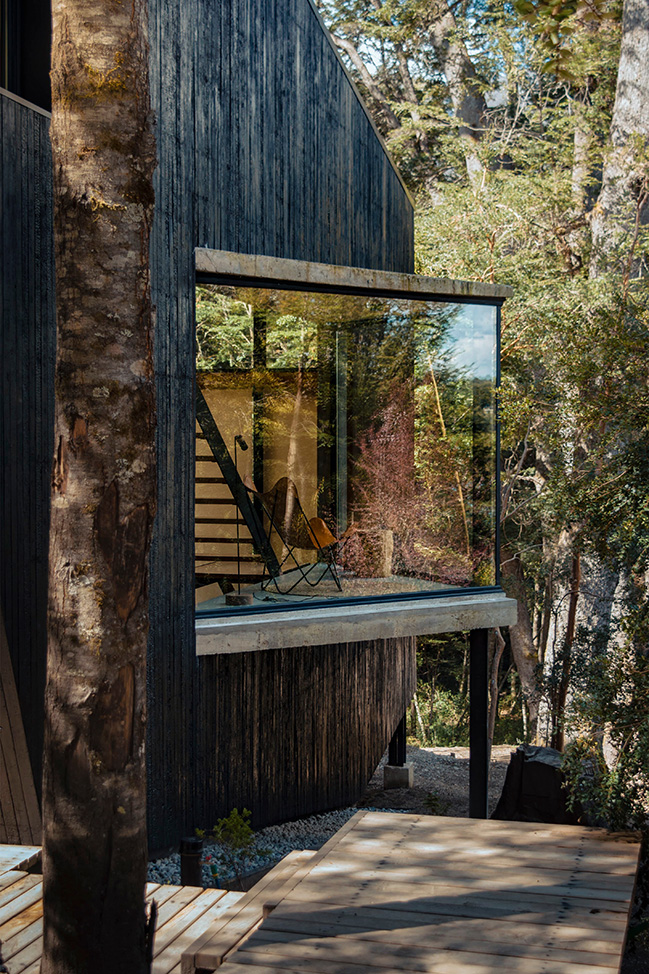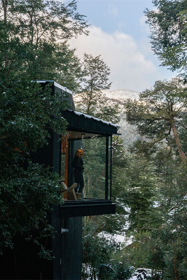 Externally, the cabins feature a rugged, rocky morphology clad in eucalyptus wood, treated with the ancient Japanese technique Shou Sugi Ban. This method—charring the wood’s surface—creates a unique texture and improves water resistance, fire retardancy, sustainability, and durability. The blackened wood serves as a backdrop that highlights the green of the trees and the white of the snow. Lapacho wood (a cinnamon-colored hardwood reminiscent of the Arrayanes), glass, black metalwork, and exposed concrete were used as complementary materials.