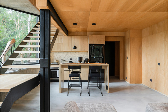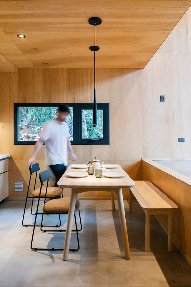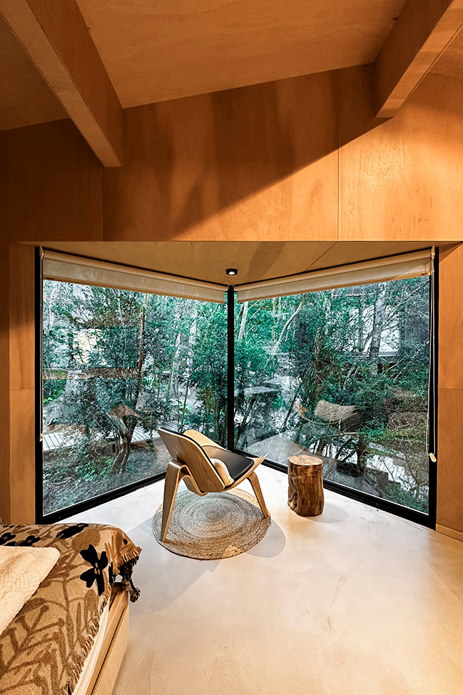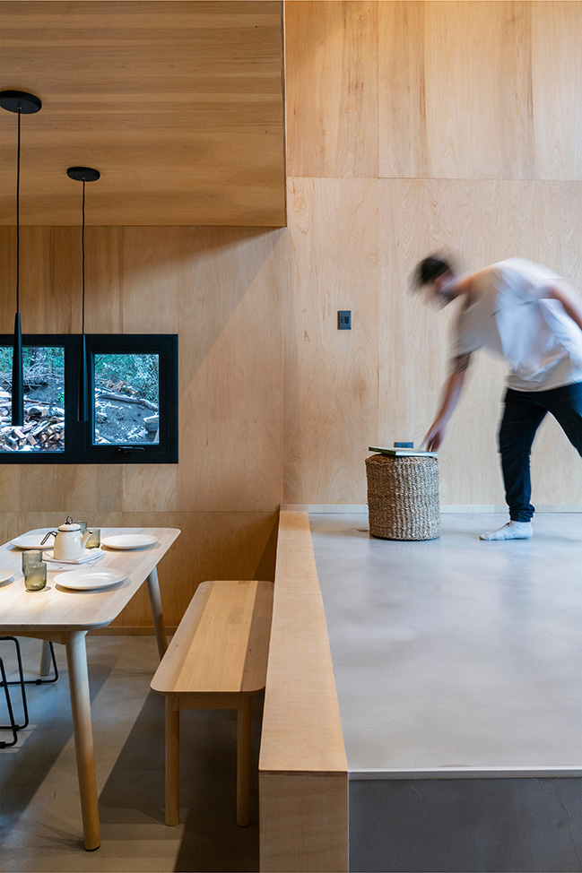 Inside, a single material dominates: Guatambú wood. Light in color and knot-free, it contrasts sharply with the dark exterior and enhances the sense of spaciousness. Used in large panels, it provided both aesthetic value and construction efficiency.