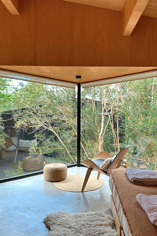 Each unit is designed as a single open space, split across half-levels and punctuated by large, strategically positioned windows. These openings extend the sense of space outward and allow the dense Myrtle canopy to provide both privacy and immersion in nature. This approach also fosters intimacy between each volume and the communal areas of the complex.