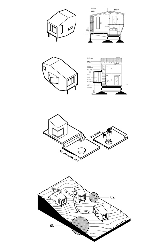 Their proposal consisted of modular “landscape cabins” for two to three guests, conceived as just another element of the forest. Each cabin blends into its surroundings with a sense of controlled randomness—sharing a common architectural language, yet featuring subtle variations that give each one a unique identity.