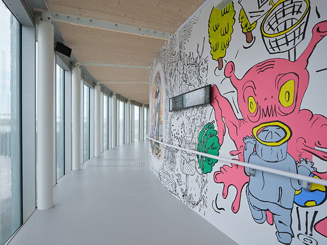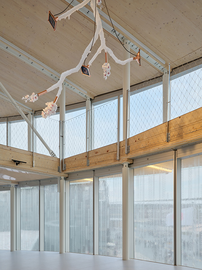 The ceilings and exposed structures are left exposed in wood. The load-bearing structure consists of a system of cross-laminated spruce CLT panels that form a central auditorium truss with embedded staircases and an elevator. The core of the house is completed by horizontally laid slabs. They help to shape the exhibition spiral outwards and the balconies of the multifunctional hall inwards.