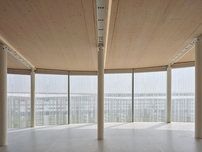The building reaches a height of 16 metres and is divided into 36 segments. The individual segments form a circle on the lower floors, on the higher floors they smoothly transition into an ellipse defining the envelope and mass of the pavilion. The space in front of the pavilion is designed as a wooden deck with boxes where visitors and passers-by can sit and contemplate.