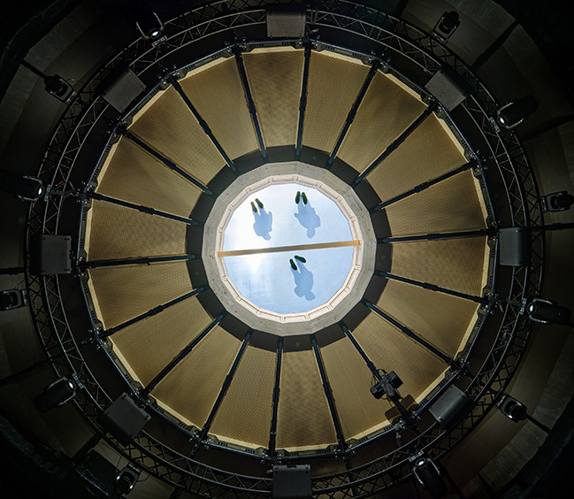 The spiral of the visitor path encircles the central tube of the multifunctional hall - the auditorium. This space at the heart of the pavilion, with an internal diameter of 15.5 metres, rises 12 metres above the ground and will be used for cultural performances, lectures and other programmes. It is designed as a black box. A ramp with seats in the auditorium follows the perimeter of the visitor path, with the auditorium and gallery connected in several places. This allows these spaces to be variably separated or seamlessly connected according to current needs.