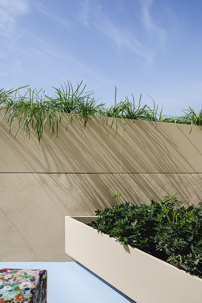 The bathroom, wrapped in reflective glass mosaic, becomes a luminous volume that enhances both light and perceived scale. Outdoors, the terrace is bordered by a bespoke planter that replaces traditional fencing, fostering a living interface between architecture and nature. These thoughtful interventions elevate the sensory quality of the space, making it feel larger, lighter, and more connected to its context.
