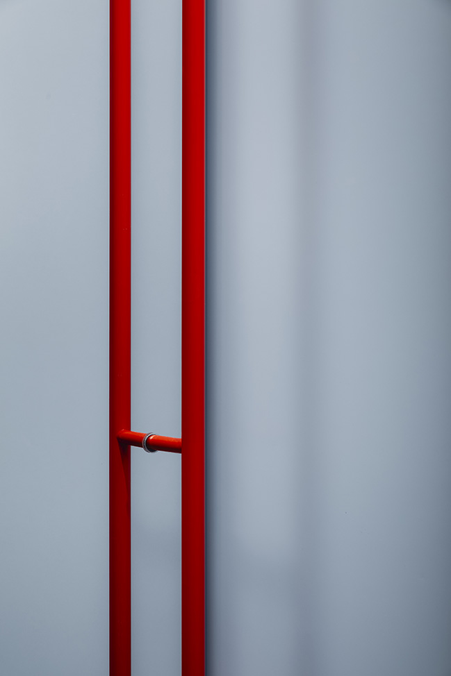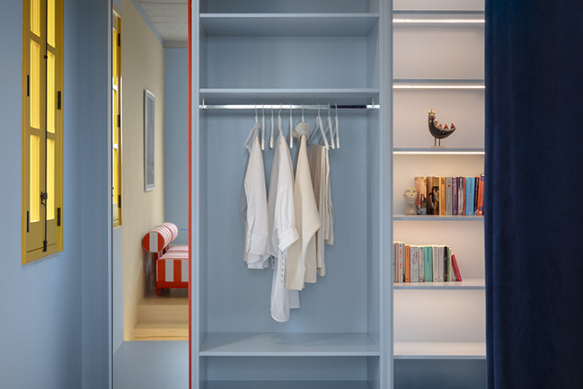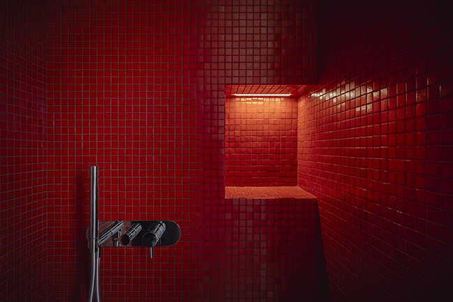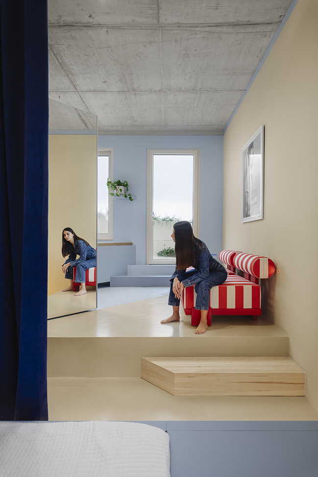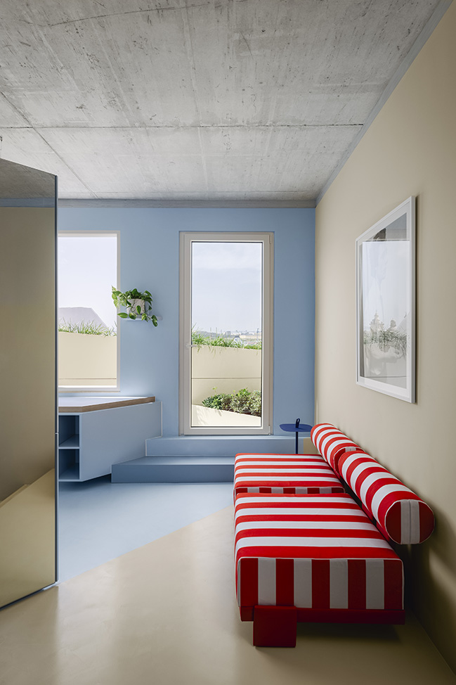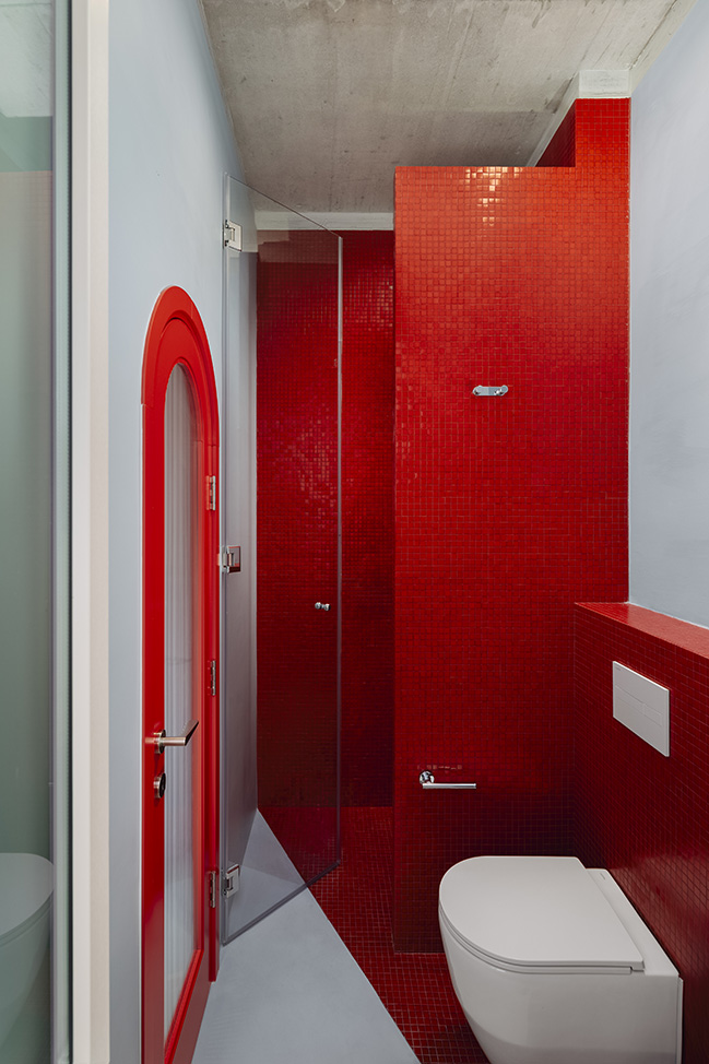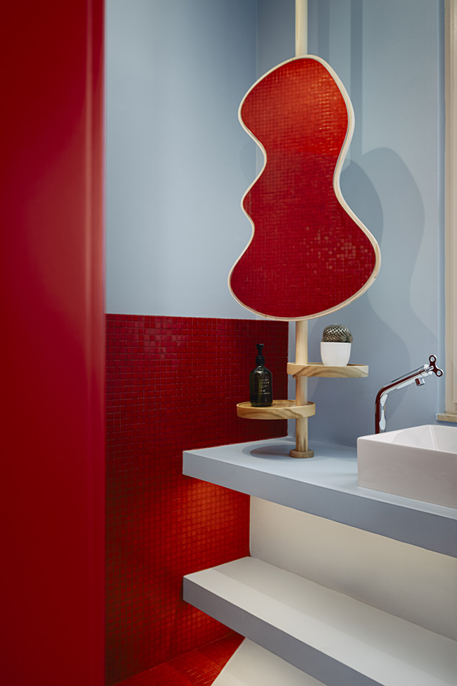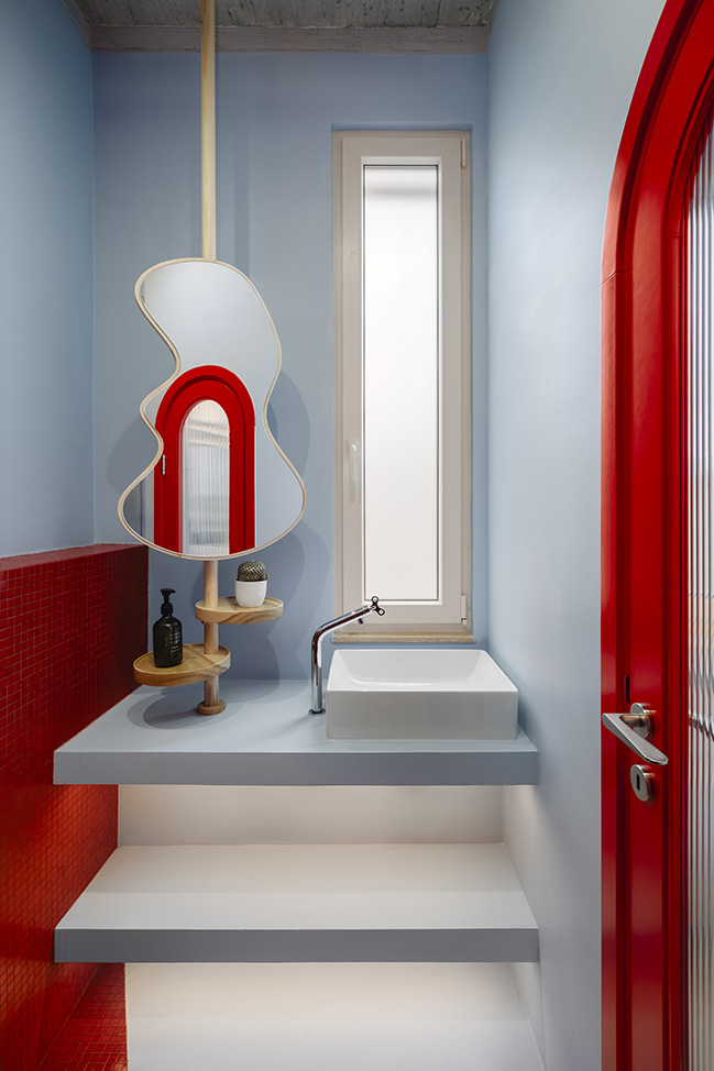 The design unfolds through a harmonious chromatic language, with sky blue and limestone beige forming the base tones. These reflect the surrounding cityscape, while vibrant punctuations of primary red in custom furnishings add an expressive layer. Two strategic visual axes structure the space, one drawing the eye toward the terrace, reinforcing the indoor-outdoor connection, and another extending from the shower area to panoramic urban views, expanding the perceived volume.