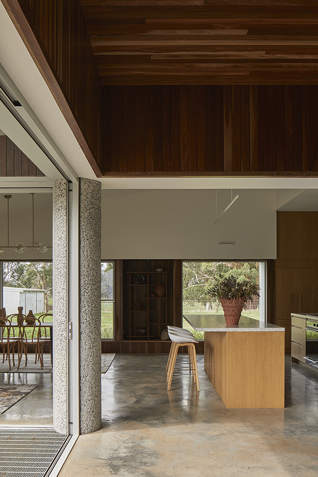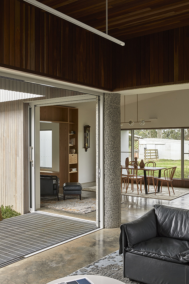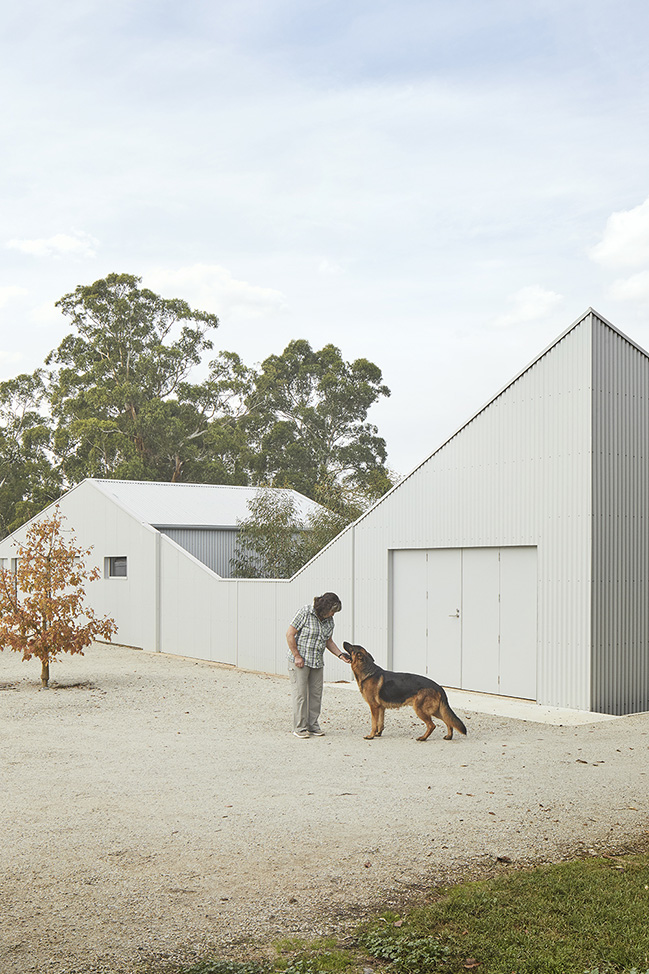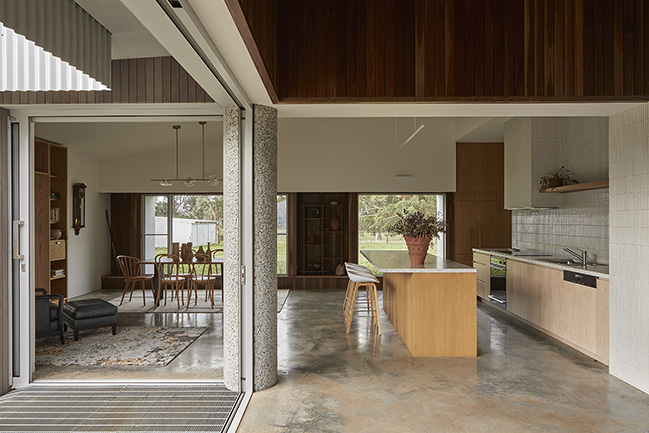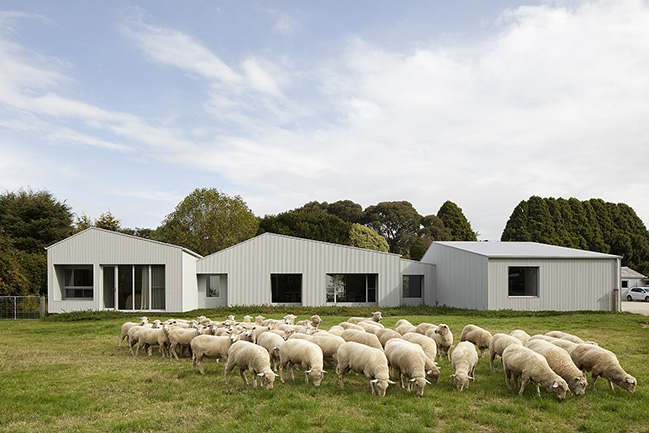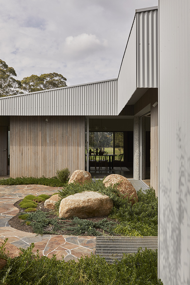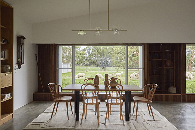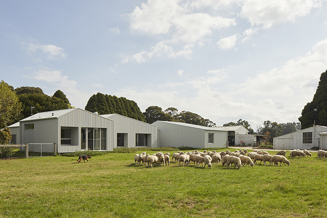 From the architect: Shady Creek is a working sheep farm located on the outskirts of Warragul in Victoria’s West Gippsland. This new farm house replaces the existing and contributes to the operational aspects of the farm while responding to the clients request that the house create a nostalgic connection to the original sheds that have been retained. The corrugated clad home references the materiality and geometries of the agricultural sheds while the home itself is a sheltered retreat from the day to day aspects of running a farm.