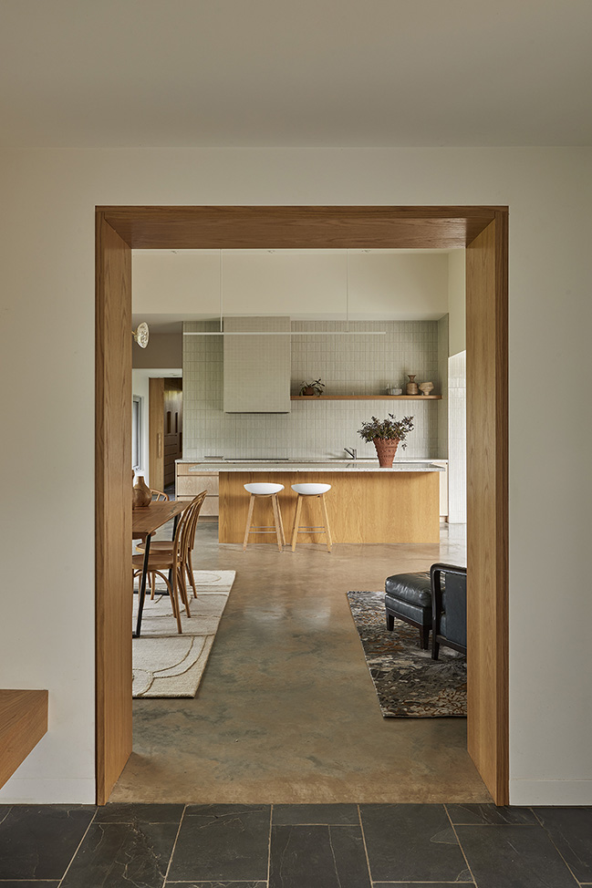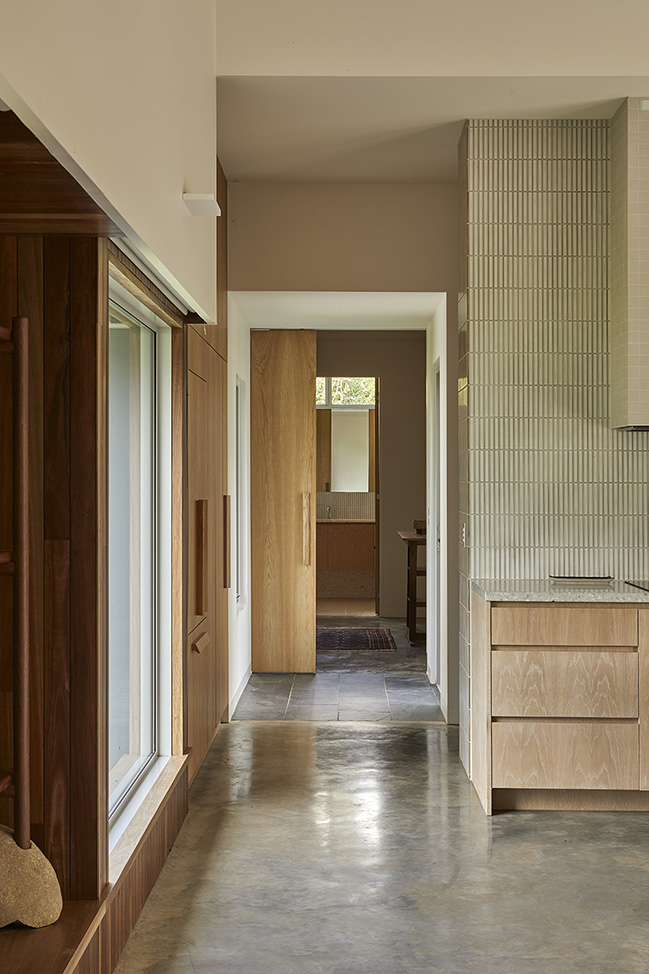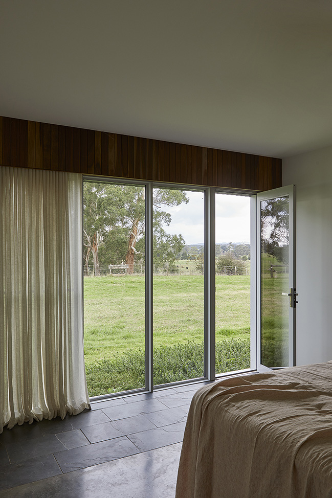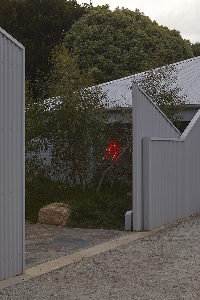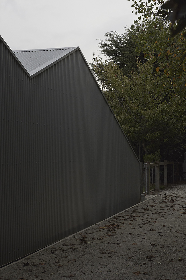 An early design decision to use a singular material for wall and roofing was clearly related to the intent of creating planning and visual connections with the original painted outbuildings however it did also provide an effective means of working to modest budget for a home of this size. The challenge we set for ourselves was to develop non-standard corrugated details throughout, creating a series of details to elevate the elegance of this every day material. By eliminating standard flashing details and junctions typically found in corrugated cladding we were able to create cleanly incised openings at windows and transition free junctions at external corners. Interestingly this approach to detailing in turn strengthened cognitive connections to the very agricultural level of construction found in the sheds. From opposite intentions resulted the same effect.