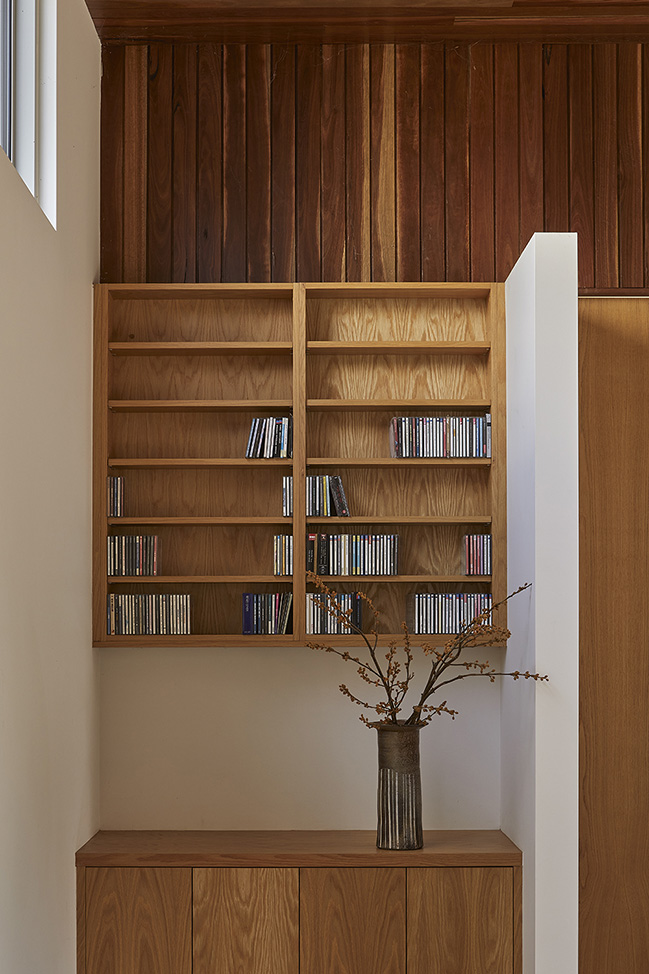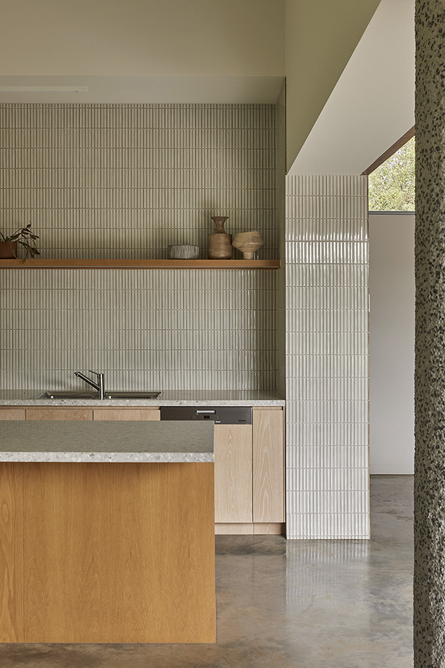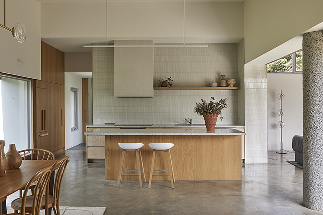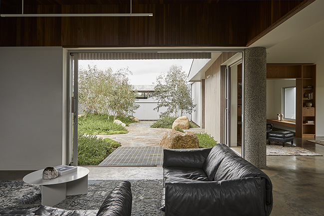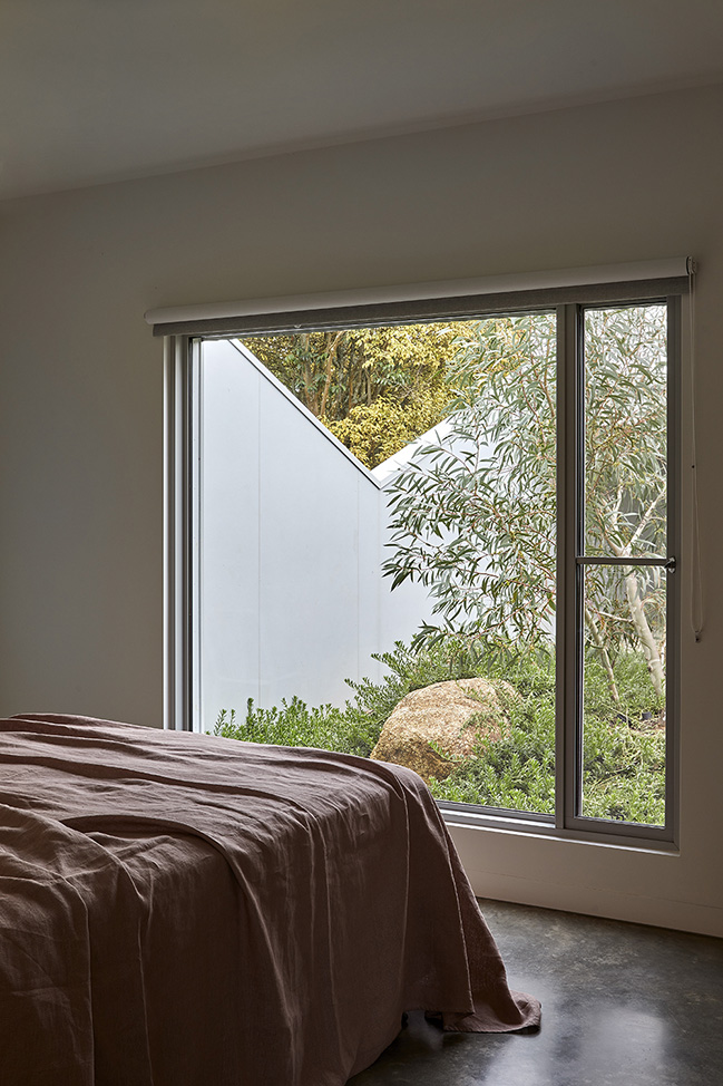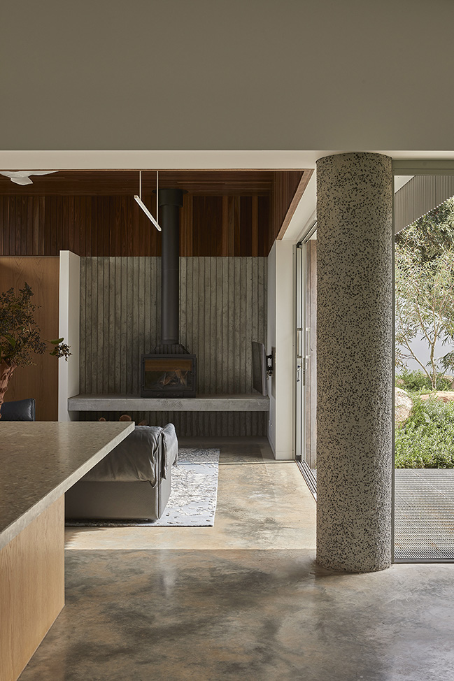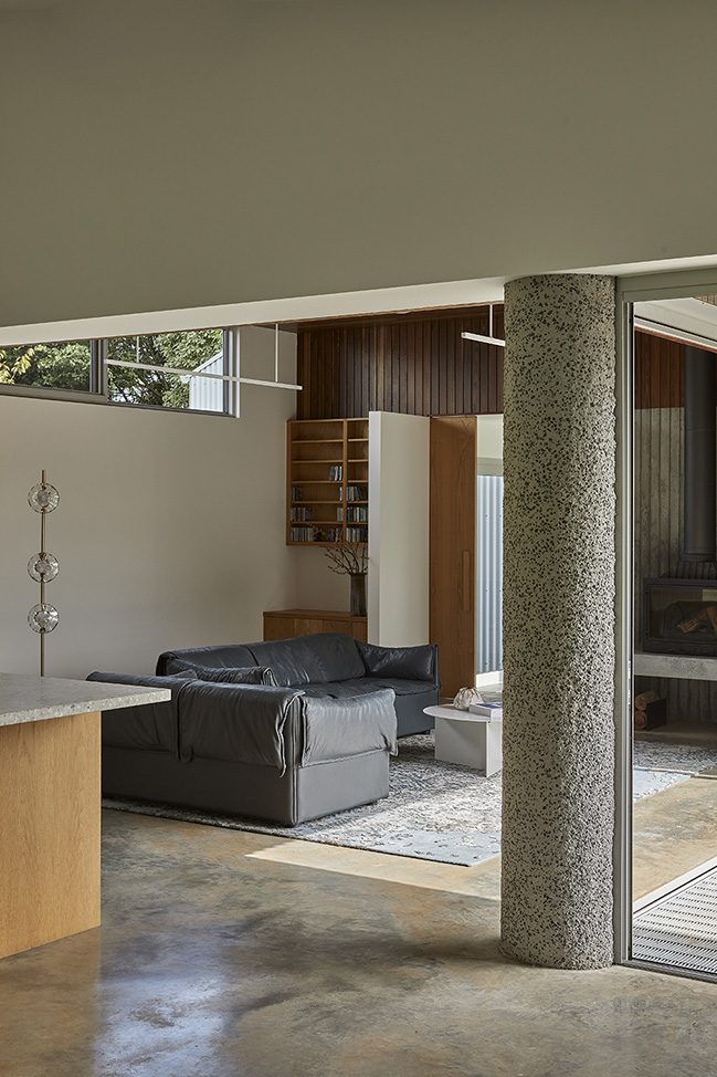 The pinwheel plan of the home radiates from a central scrabbled concrete column that sliding doors engage into, when open the column a is free standing element connecting living spaces with garden. Therefore, the column centres living, dining, kitchen and garden as equally weighted spaces that seamlessly connect to each other. The pinwheel plan approach continues through to the arrangement of the secondary spaces which are individually housed in separate volumes each with a linked connection to the heart of the home.