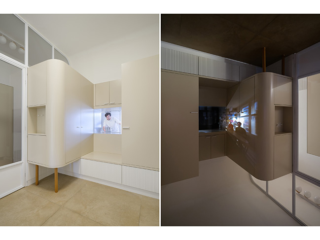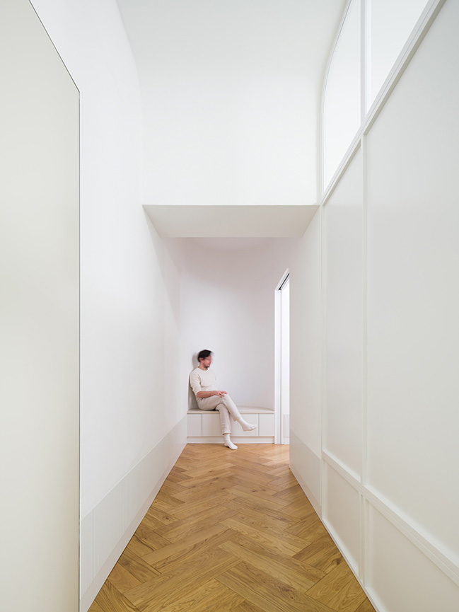 We first started, paradoxically, by wasting space. We inserted a completely new long communication space in the middle of the layout, even longer than we needed, and rounded it at its ends and provided it with seating and storage spaces. For a sense of intimacy and for hygienic reasons, we then screened the apartment from the hallway with an entrance hall, into which we let daylight in both directly through the kitchen unit and through a generous glass wall.